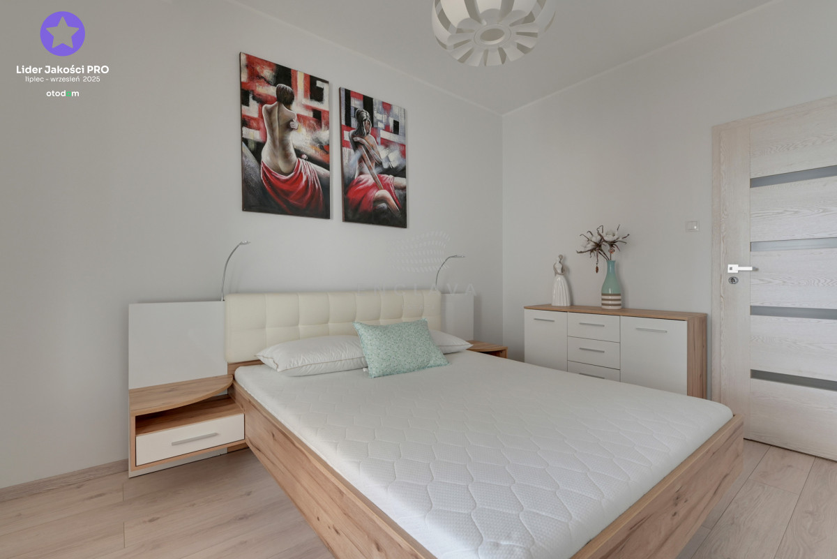 - Sypialnia obejmuje duże łóżko, komodę, szafki nocne oraz telewizor,