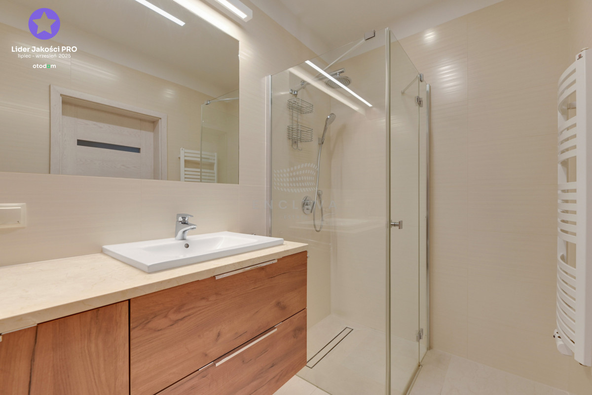 - Łazienka wyposażona jest w kabinę prysznicową, umywalkę oraz zabudowę szafek,